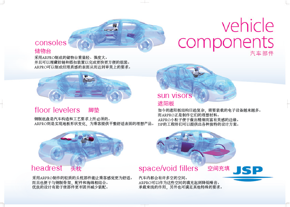 杰斯比塑料(上海)有限公司EPP产品具有轻量、高强度的构造、隔热、隔音性能,可以广泛用于各种车辆。自从1982年在北美的首次使用保险杠开始,ARPRO便广泛应用于保险杠、后备箱、遮阳板、脚踏垫,座椅芯材等用途上。